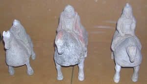 展柜里的這些兵馬俑身披鎧甲是目前國內(nèi)發(fā)現(xiàn)最早的甲馬騎俑。鎧甲由波斯傳人我國到北魏時已相當(dāng)普及。